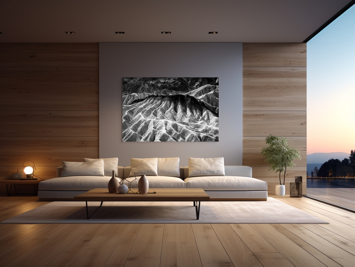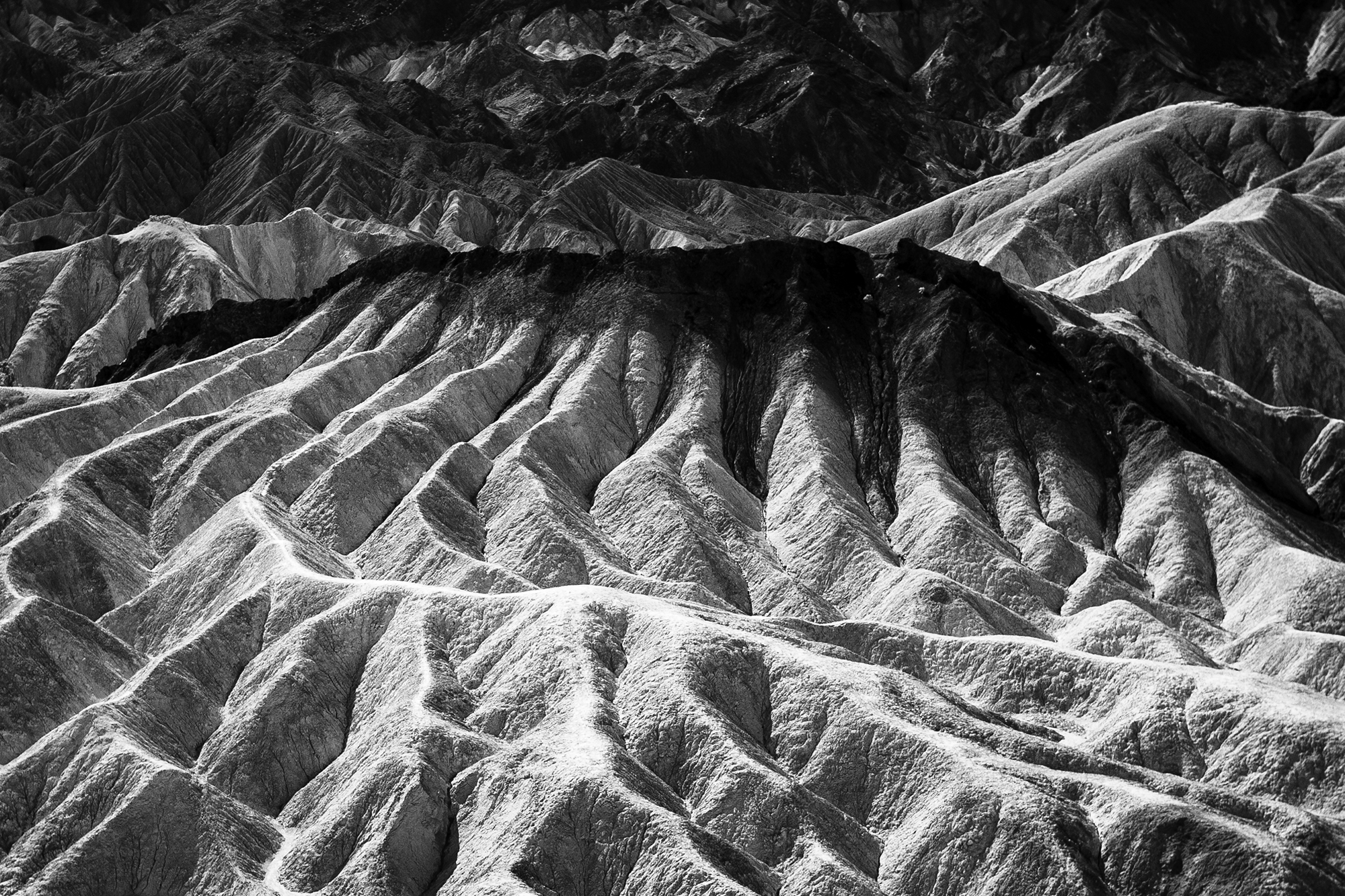 The artwork is a black-and-white photograph capturing an intricate landscape of eroded geological formations. The composition focuses on the ridges and furrows of the terrain, emphasizing the textures and patterns created by natural erosion. Light and shadow create a dramatic contrast, highlighting the depth and complexity of the topography. The image showcases the raw and rugged beauty of the natural world, presenting a visually striking and detailed portrayal of the landscape.