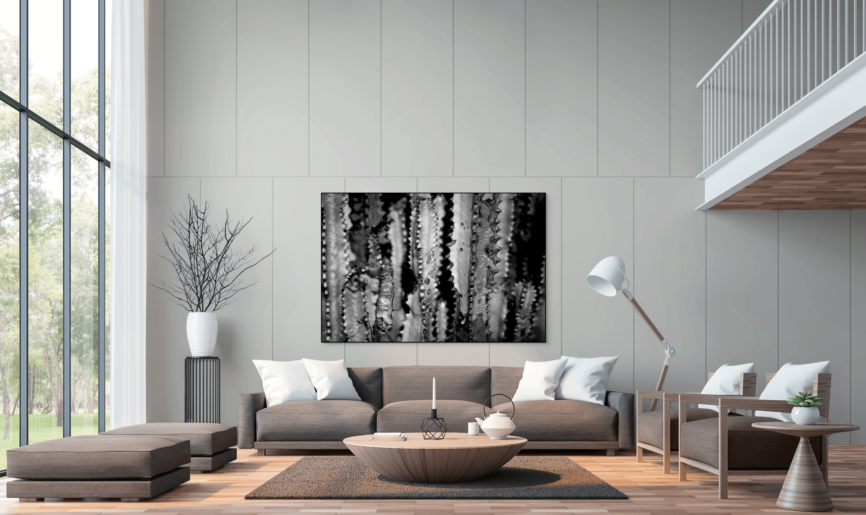 This is a black-and-white photograph that depicts a close-up view of cactus plants. The image captures the intricate textures and details of the cacti, highlighting the spines and rough surfaces. The grayscale tones enhance the contrast, making the spines and creases of the plants stand out sharply against the background. The composition focuses on the cacti, emphasizing their vertical forms and the organic, almost architectural quality of their structure.