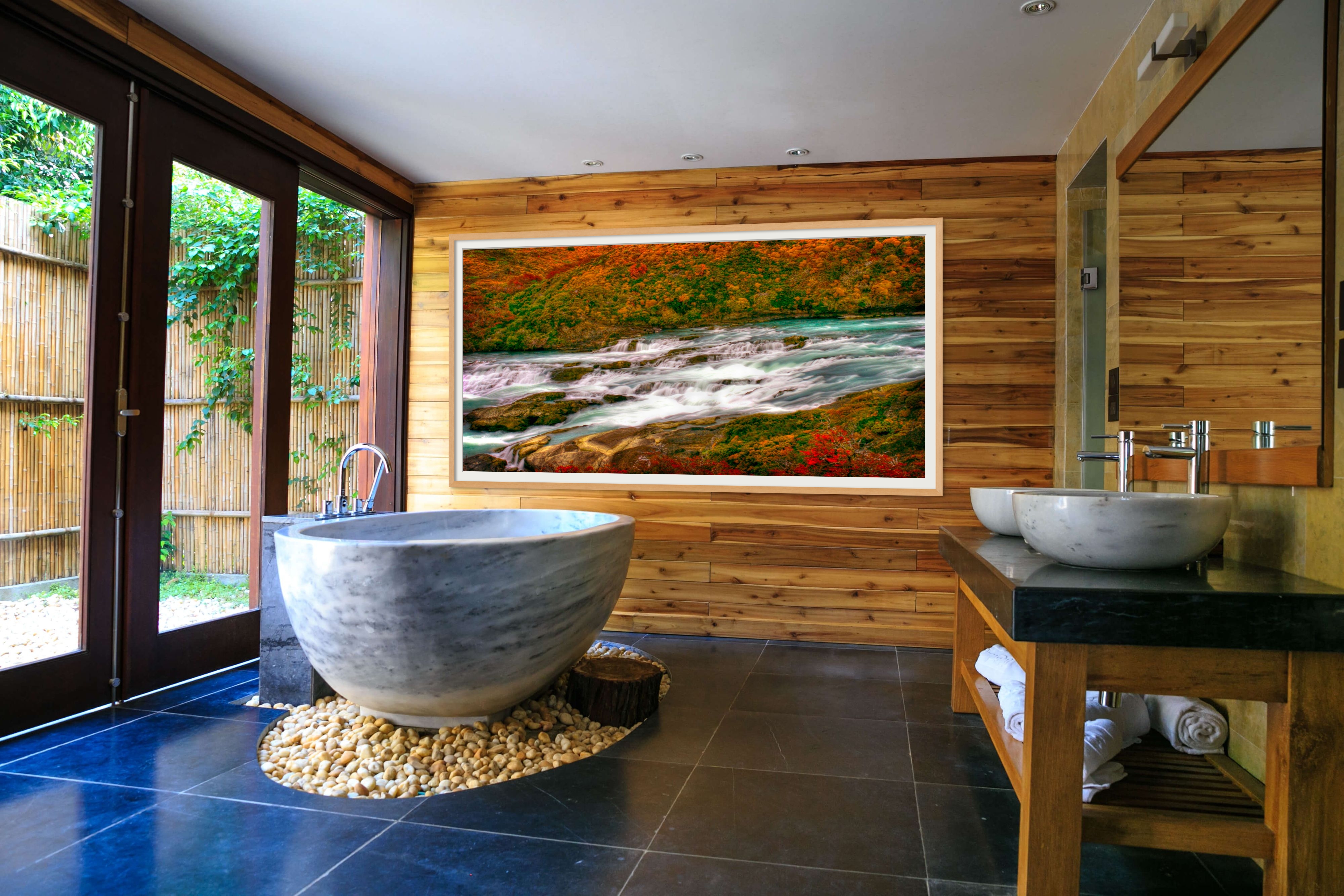 The artwork is a richly colored landscape photograph of a river with cascading waterfalls. The water flows over multiple rock formations, creating a dynamic sense of movement. The surrounding landscape is lush and vibrant, with an array of autumnal foliage in shades of green, orange, and red. The river's turquoise water contrasts beautifully with the warm-toned vegetation, adding depth and visual interest to the scene. The overall composition is both serene and dramatic, capturing the natural beauty and seasonal transition of the environment.