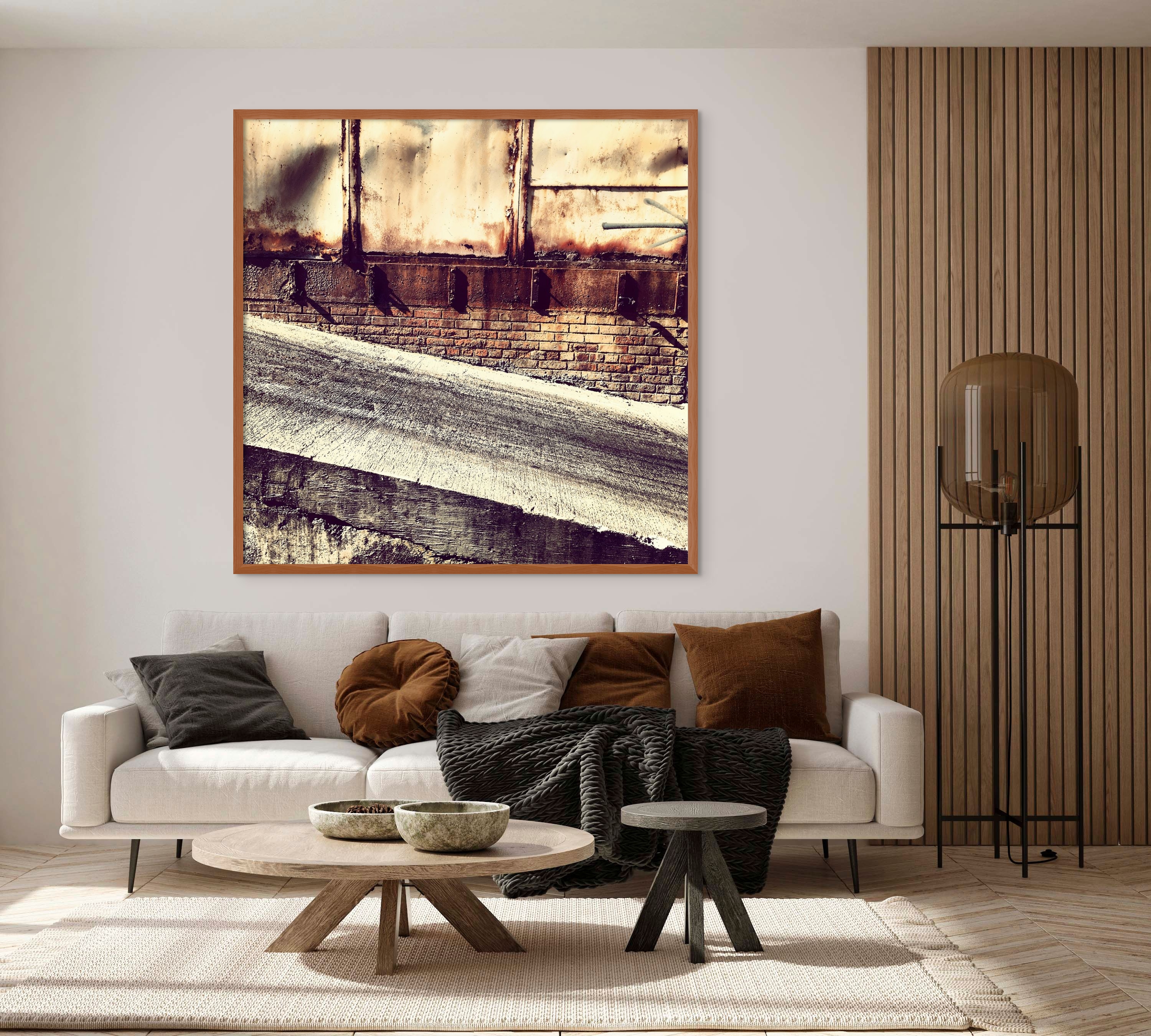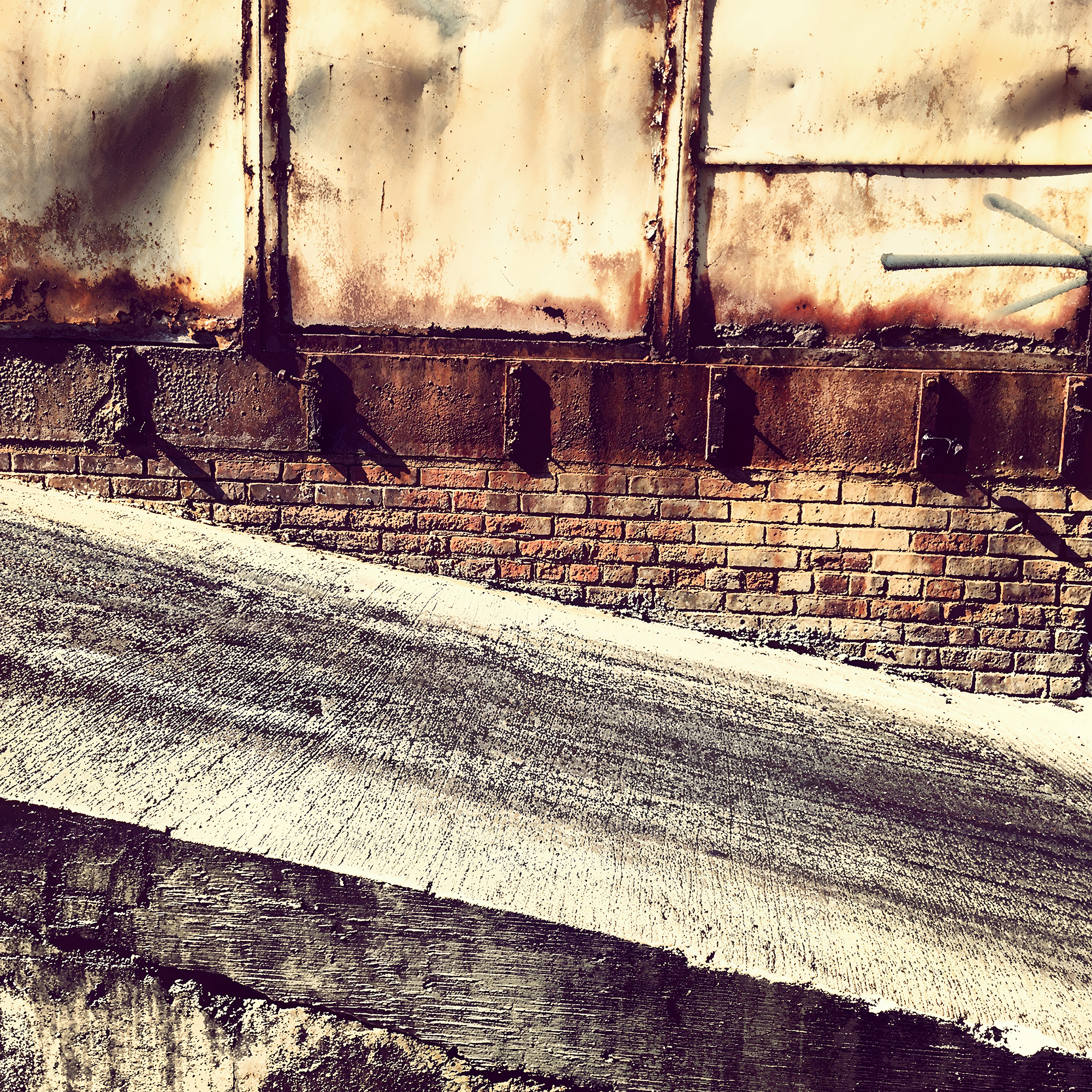 The artwork is a photograph capturing a gritty urban scene with strong geometric lines and textures. The image focuses on a weathered, rust-streaked wall composed of metal and brick. Horizontal sections create a visually engaging contrast between the industrial materials. The ground in the foreground has a textured, sloping concrete surface with a pool of water reflecting part of the scene, adding depth. The photo utilizes light and shadow effectively, creating a dramatic interplay that accentuates the aging and weathered quality of the scene. The overall palette highlights earthy tones and metallic rusts, conveying a sense of urban decay and history.