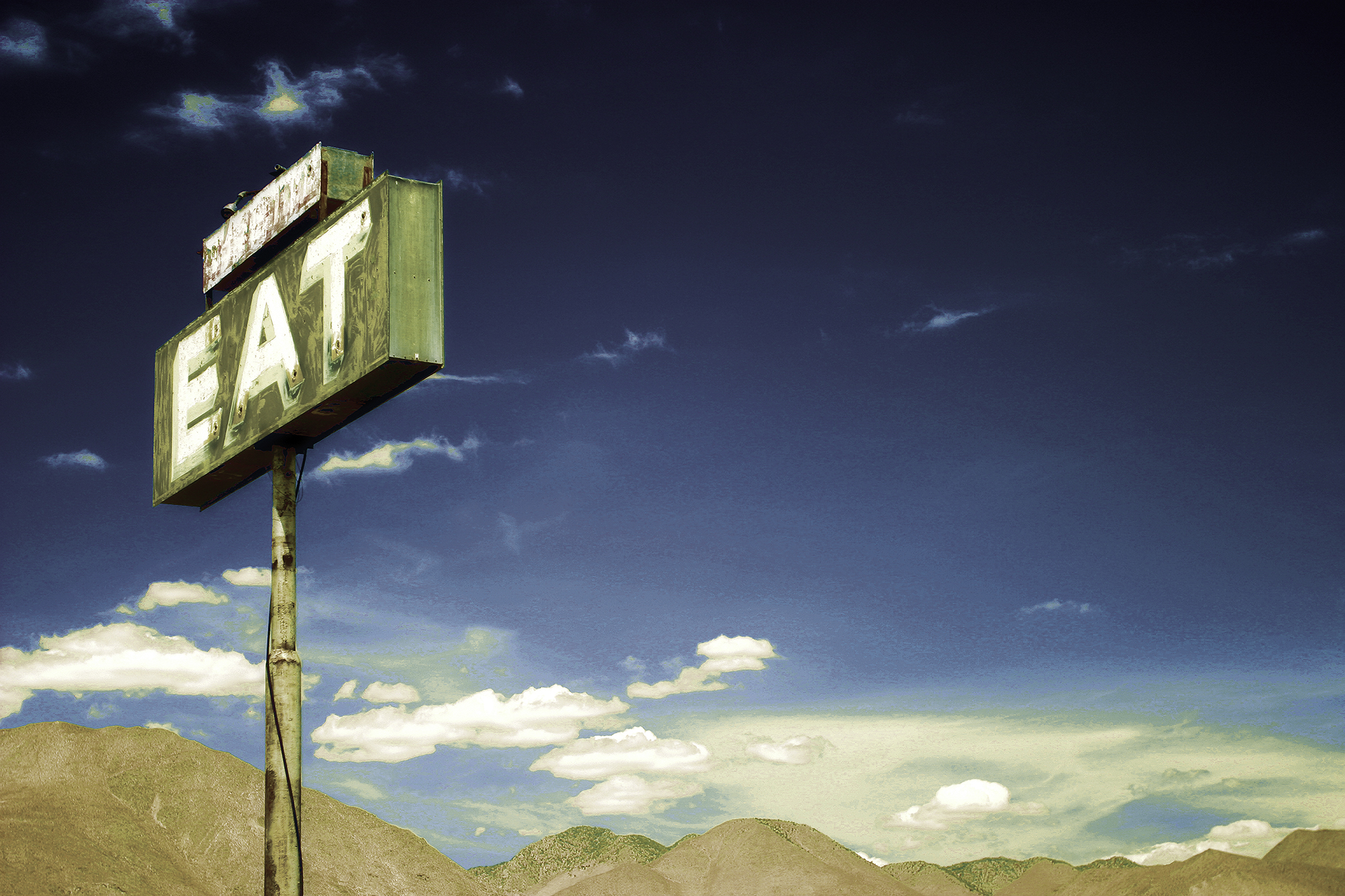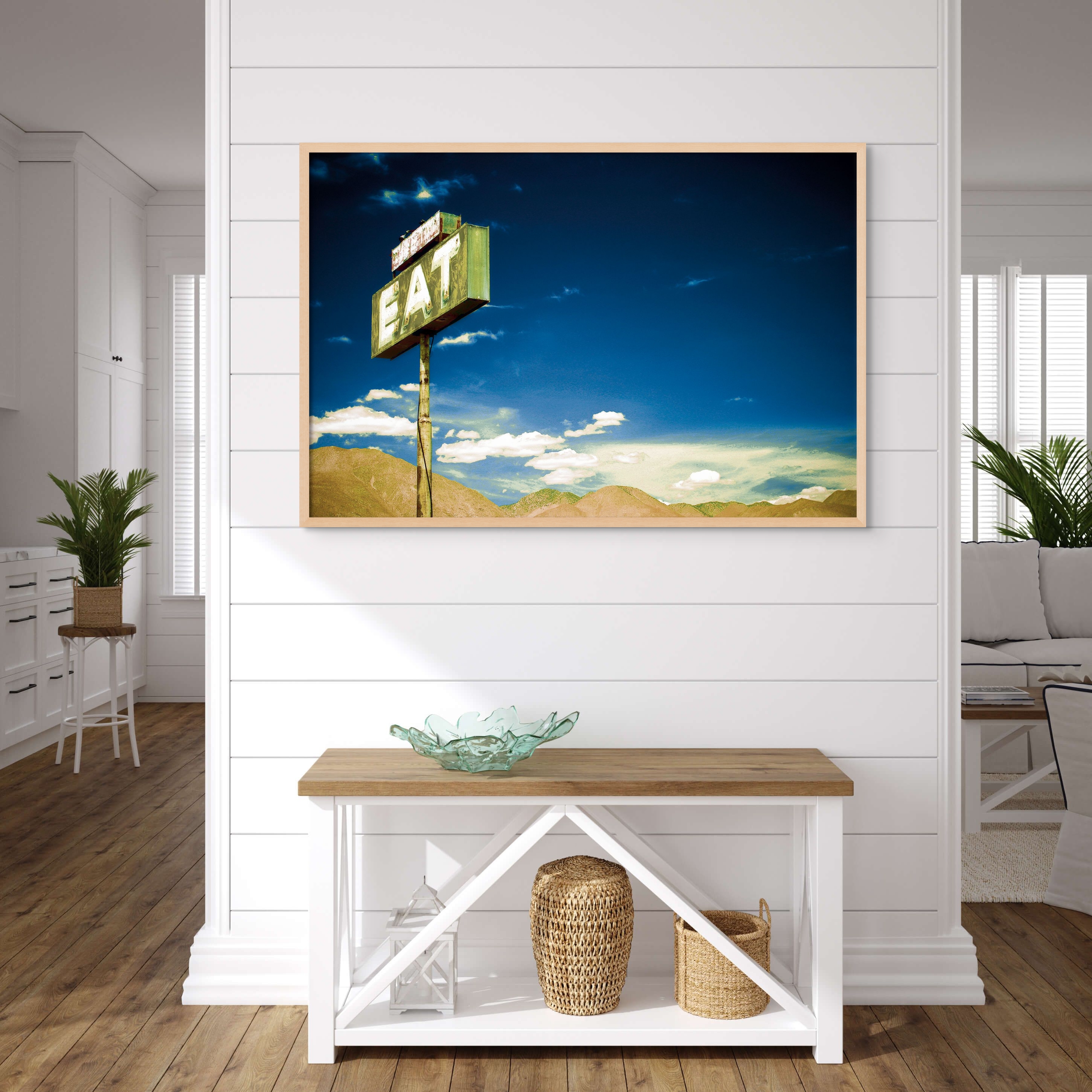 A large, vintage signboard prominently displaying the word "EAT." The signboard is mounted on an aged, wooden pole that stands in the foreground of the image. The background showcases a clear, vibrant blue sky with scattered, fluffy white clouds. Distant mountains enhance the scenic landscape, adding depth and a sense of open space to the photograph. The overall composition gives a nostalgic and tranquil feel, capturing a moment of simplicity and solitude in a seemingly remote location.