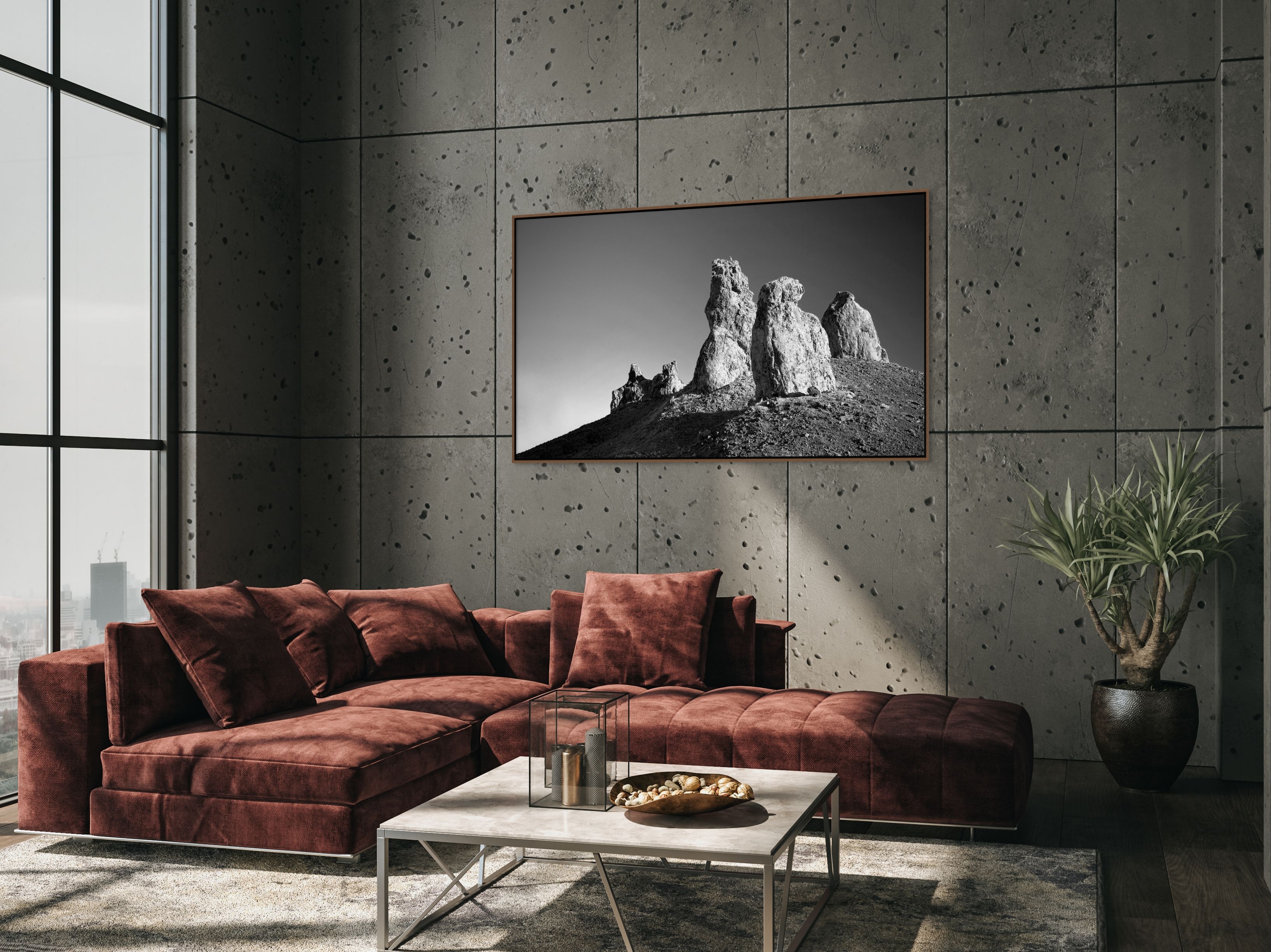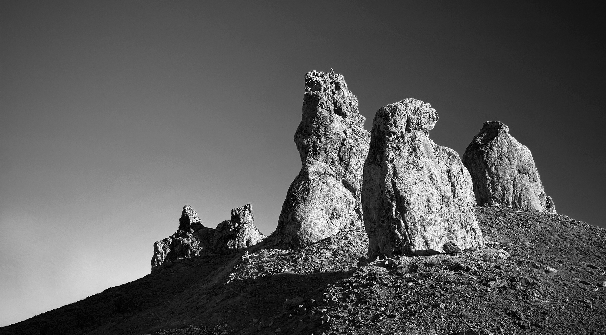 A group of tall, jagged rock formations rising from a rugged, uneven landscape. The rocks possess varied shapes and textures, casting distinct shadows that add depth and contrast to the scene. The sky in the background is clear and gradient, transitioning smoothly from light to dark, emphasizing the starkness of the rocky terrain. The overall composition highlights the natural beauty and dramatic forms of the rock structures, creating a sense of timeless majesty and solitude.
