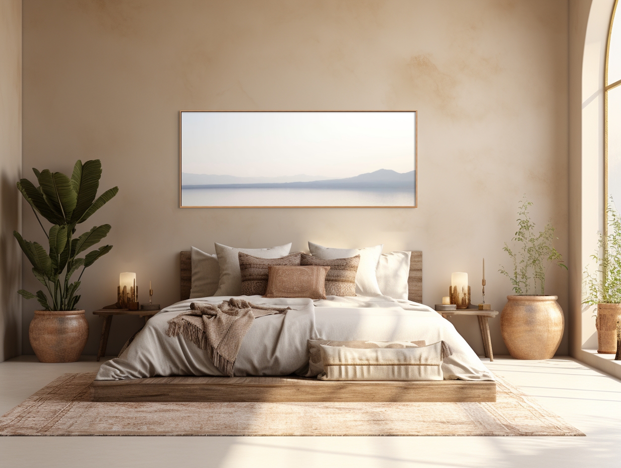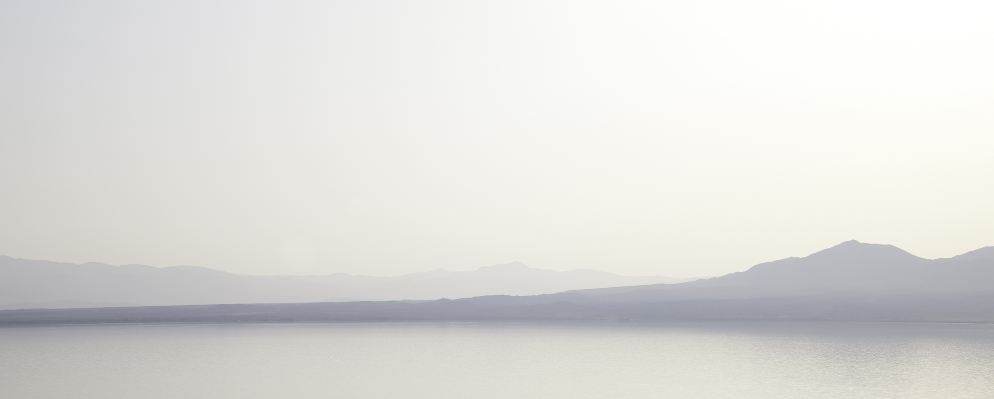 A serene and minimalist landscape, featuring a tranquil body of water in the foreground and distant mountains in the background. The color palette is predominantly soft and muted, consisting of gentle hues of light blue, pale gray, and subtle earthy tones. The overall ambiance of the scene is calm and quiet, evoking a sense of peace and vastness.