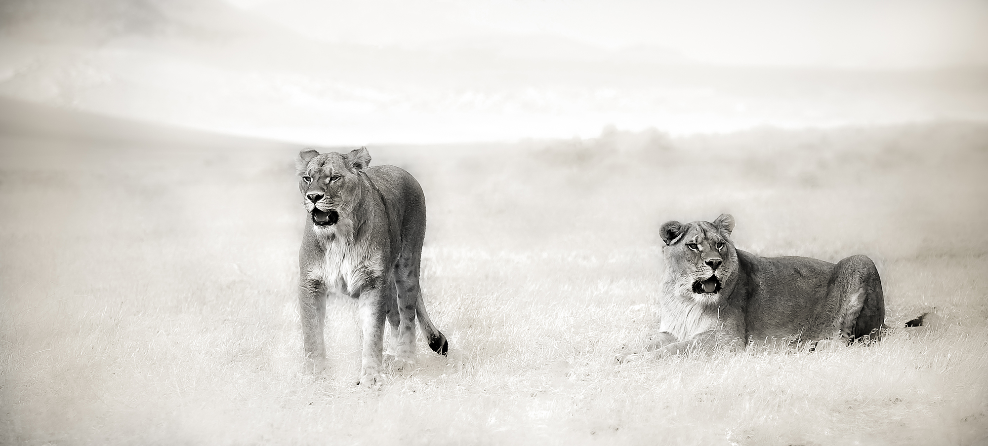 A serene scene of two lions in a monochromatic palette. One lion is standing on the left, while the other is lying down on the right. Both lions are set against a soft, blurred background that emphasizes the open, grassy landscape they inhabit. The photograph has a dreamy, almost ethereal quality, with delicate lighting that highlights the majestic features of the lions and the tranquil environment around them.
