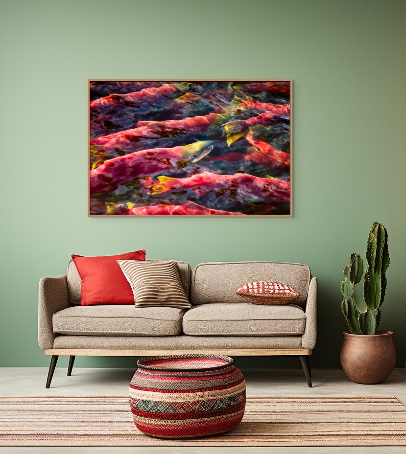 The artwork depicts an underwater scene brimming with a dense school of vibrant salmon, predominantly showcasing hues of red and pink. The fishes' bodies and fins display an array of striking colors, highlighted with patches of yellow and green, creating a captivatingly dynamic and colorful composition. The water's surface offers a fluid, distorted reflection of the fish beneath, enhancing the image with a natural, almost abstract texture that heightens the visual interest. The interplay of light and water contributes to the overall depth and movement captured in this lively and richly colored portrayal of marine life.