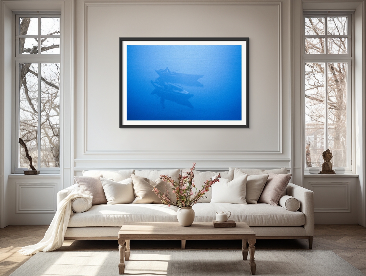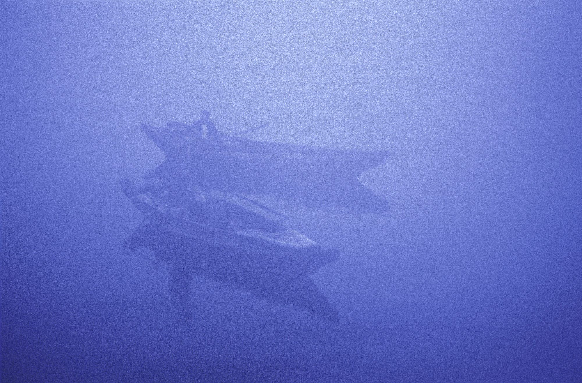 This artwork is a photograph that portrays two boats in a misty or foggy environment. The entire image is enveloped in a monochromatic blue tint, creating an ethereal and tranquil atmosphere. The boats have a ghostly quality as they are partially obscured by the dense fog, evoking a sense of mystery and calmness. The scene is serene and otherworldly, emphasizing the stillness of the moment captured in the photograph.
