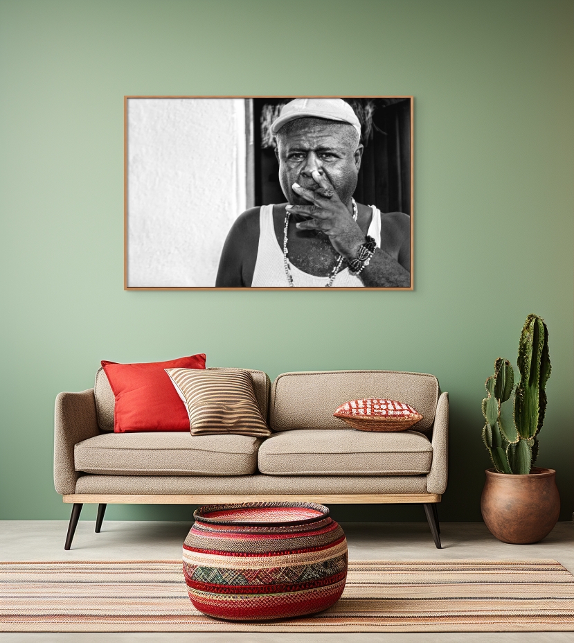 The artwork is a monochromatic photograph of a man captured mid-gesture. He dons a sleeveless shirt and a cap, accessorized with a necklace and multiple bracelets. The man is in the act of smoking a cigarette, with his hand positioned close to his face. The photo is shot in black and white, highlighting the texture of his skin and the details of his accessories. The image exudes a raw, candid emotion, foregrounding the character and presence of the subject.