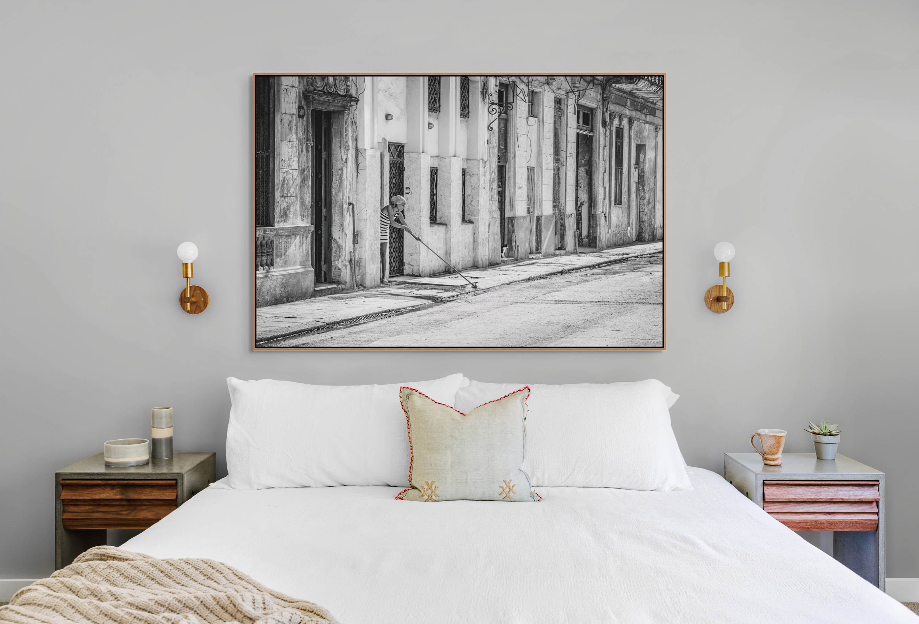 This artwork is a black-and-white photograph capturing an urban streetscape with a focus on an individual sweeping the sidewalk. The person is standing in the threshold of a doorway, extending a broom to clean the street. The architecture of the buildings lining the street reveals worn and weathered façades, giving a sense of history and age to the scene. The lighting creates sharp contrasts, highlighting the textures and details of the buildings as well as casting distinct shadows. The composition directs the viewer's attention towards the act of sweeping, imbuing the ordinary moment with a sense of quiet diligence and daily life.