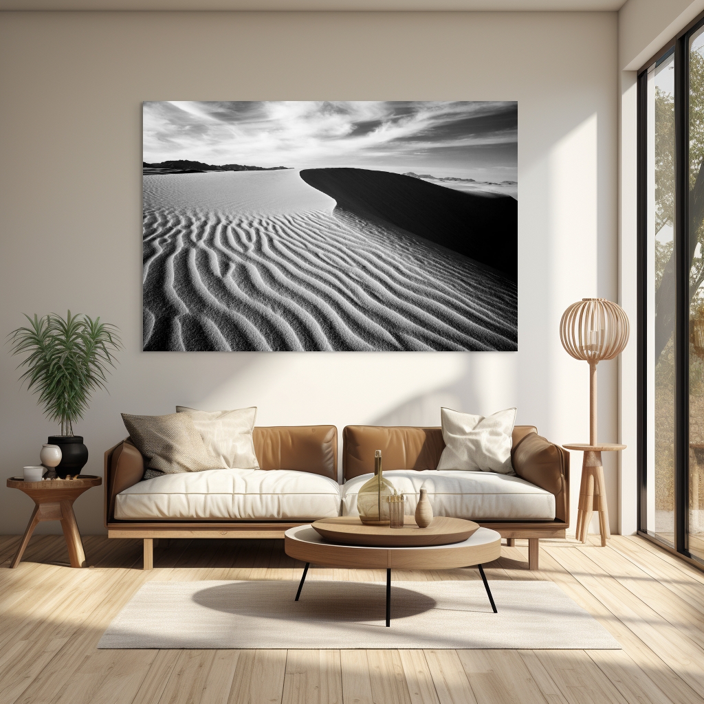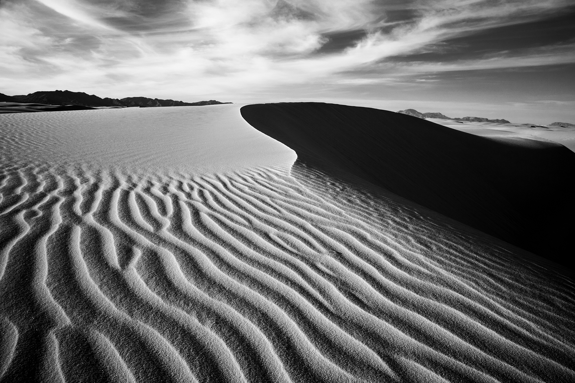 The artwork is a black and white photograph of a sand dune in a desert landscape. The composition highlights the graceful, flowing lines and patterns created by the wind on the surface of the sand. The ridges in the foreground create a sense of movement and texture, leading the eye towards the high, curved crest of the dune, which casts a deep shadow on the slope. The sky is dramatic, with soft, wispy clouds against a backdrop of lighter and darker tones, adding depth and contrast to the scene. The photograph captures a tranquil and timeless moment in nature, emphasizing the interplay of light and shadow, texture, and form.