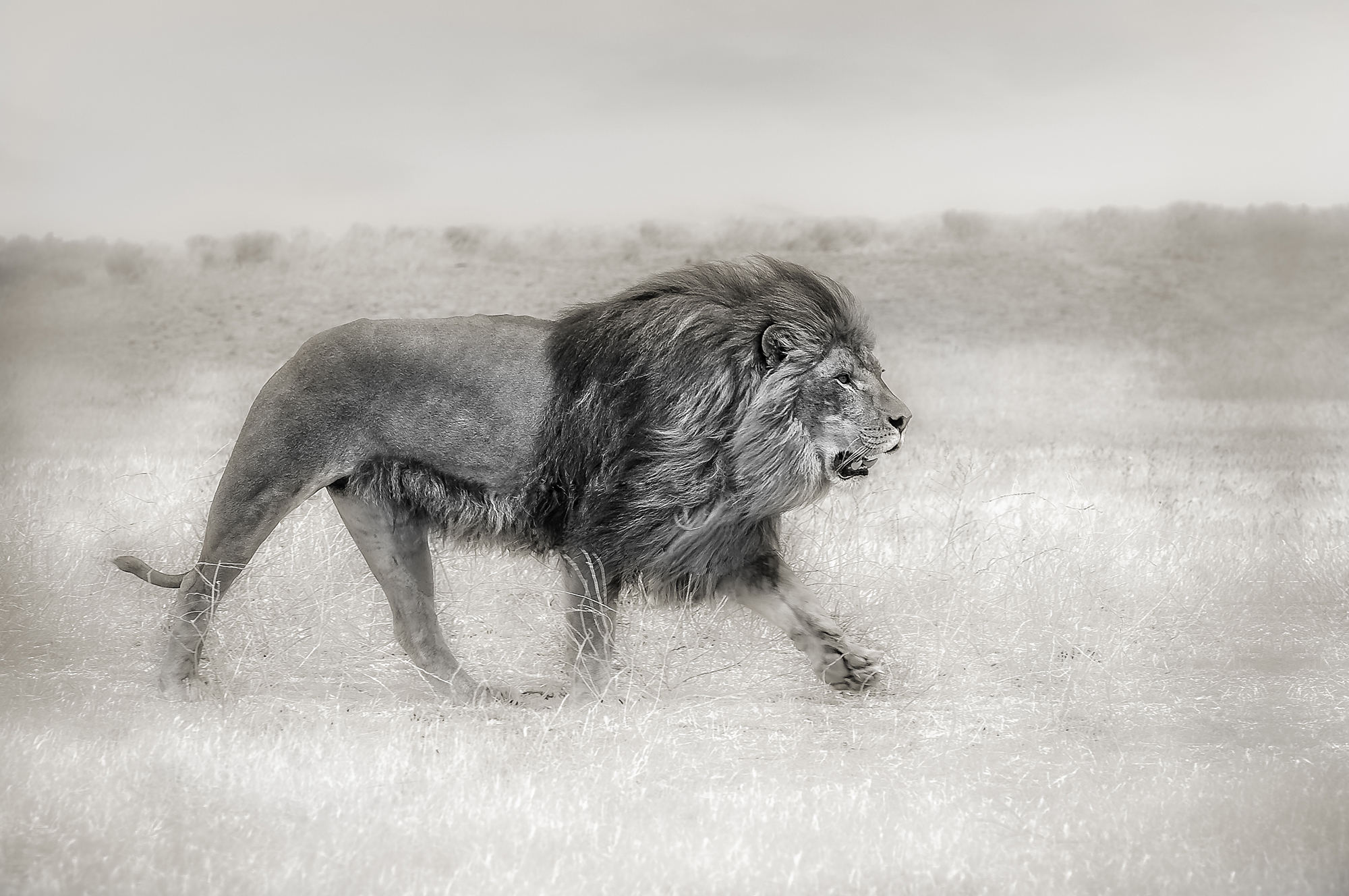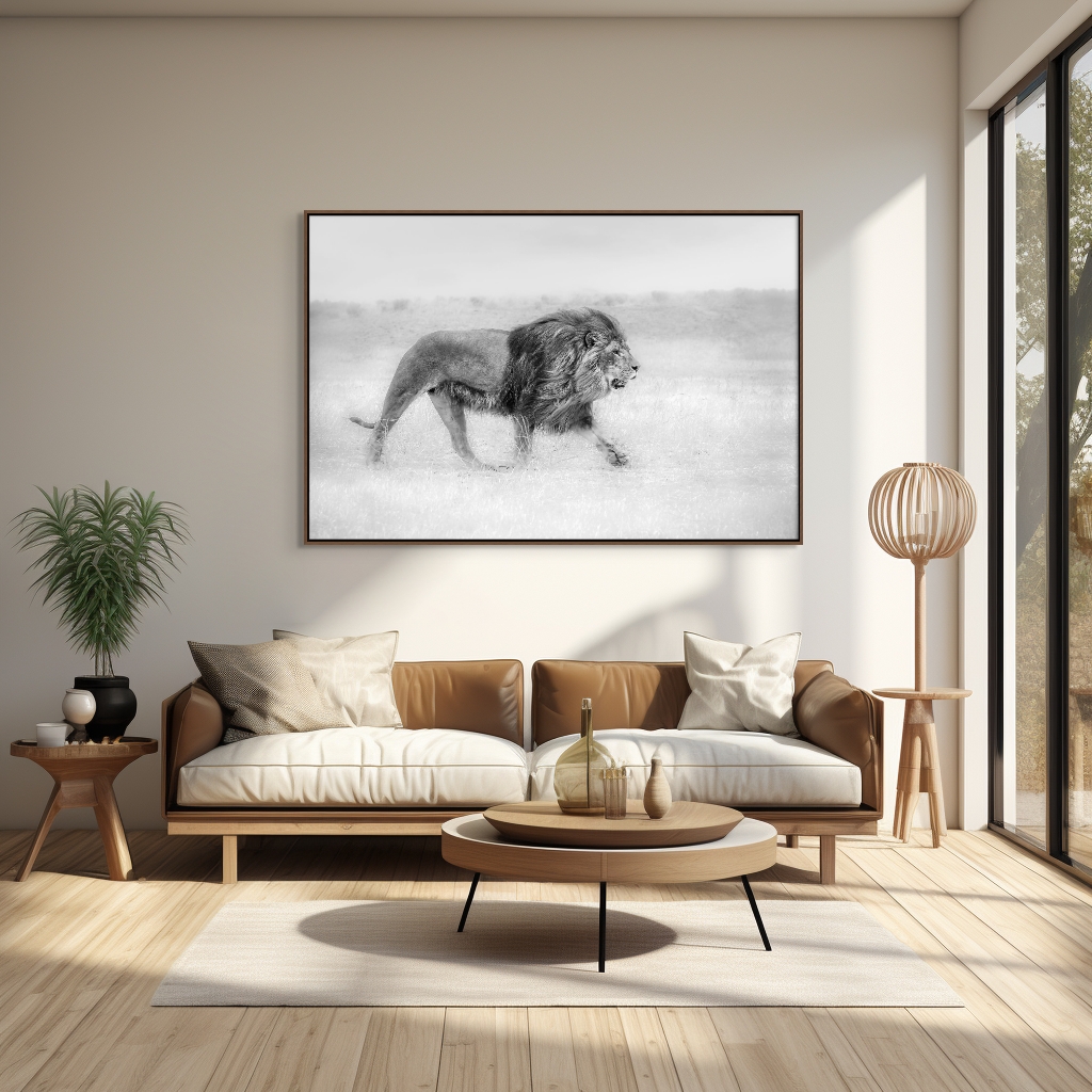 This artwork is a black and white photograph of a majestic lion walking through a grassy area. The lion's powerful stride and impressive mane are captured in sharp detail, highlighting its strength and regality. The background is minimalistic, with soft focus blending into the horizon, allowing the lion to stand out prominently as the focal point of the photograph. The use of black and white adds a classic and timeless quality to the image, emphasizing the textures and contrasts within the scene.