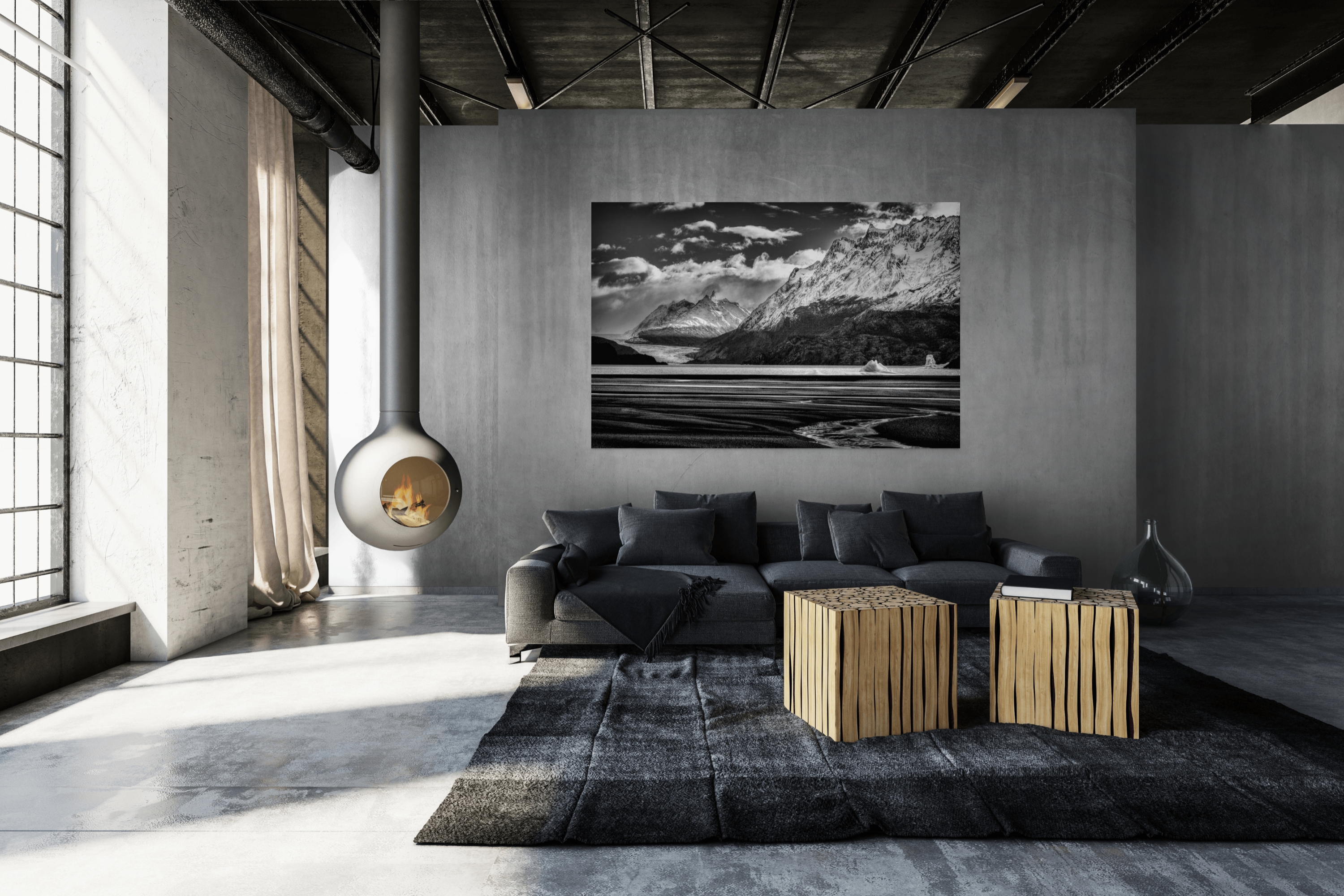 This black-and-white photograph showcases a stunning landscape featuring snow-capped mountains towering above a body of water. The mountains, with their sharp and rugged peaks, dominate the right side of the image, contrasting beautifully with the smoother, rolling hills on the left. In the foreground, bands of dark, textured sand or perhaps a tidal flat lead the eye towards the serene water where a couple of icebergs float gently. The sky is dramatic, filled with a mix of fluffy clouds and somewhat ominous shadows, adding depth and mood to the scene. The interplay between the light and shadows enhances the textures and details of the mountains and the flowing water, creating a dynamic and captivating visual experience.