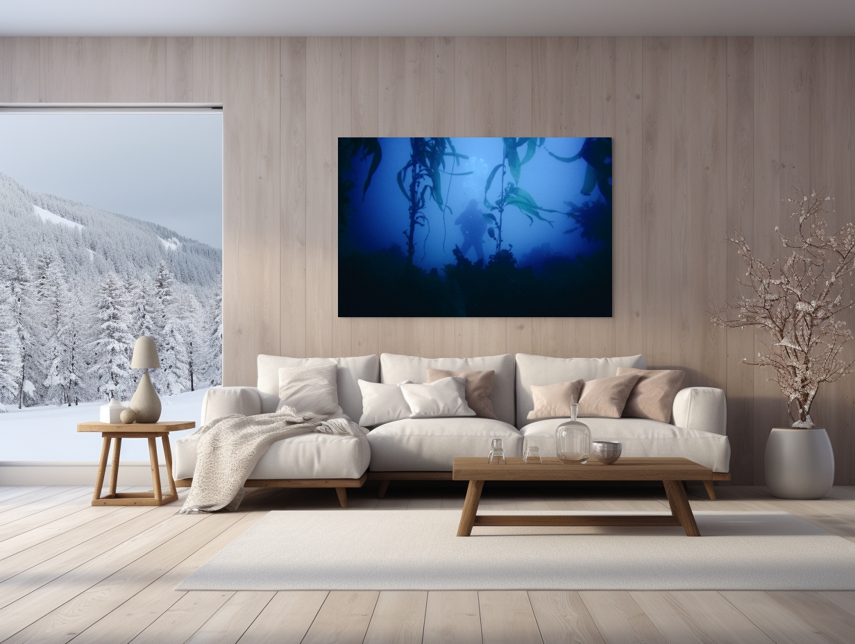 The artwork is an underwater photograph featuring a diver amidst a dense kelp forest. The scene captures the serene and somewhat mystical atmosphere beneath the ocean surface, with shades of deep blue dominating the image. The diver, centrally positioned, is enveloped by flowing kelp leaves, creating a sense of immersion and exploration in the underwater environment. Bubbles from the diver's breathing apparatus rise upwards, adding a dynamic element to the otherwise tranquil composition. The photograph conveys a sense of adventure and the beauty of the marine ecosystem.