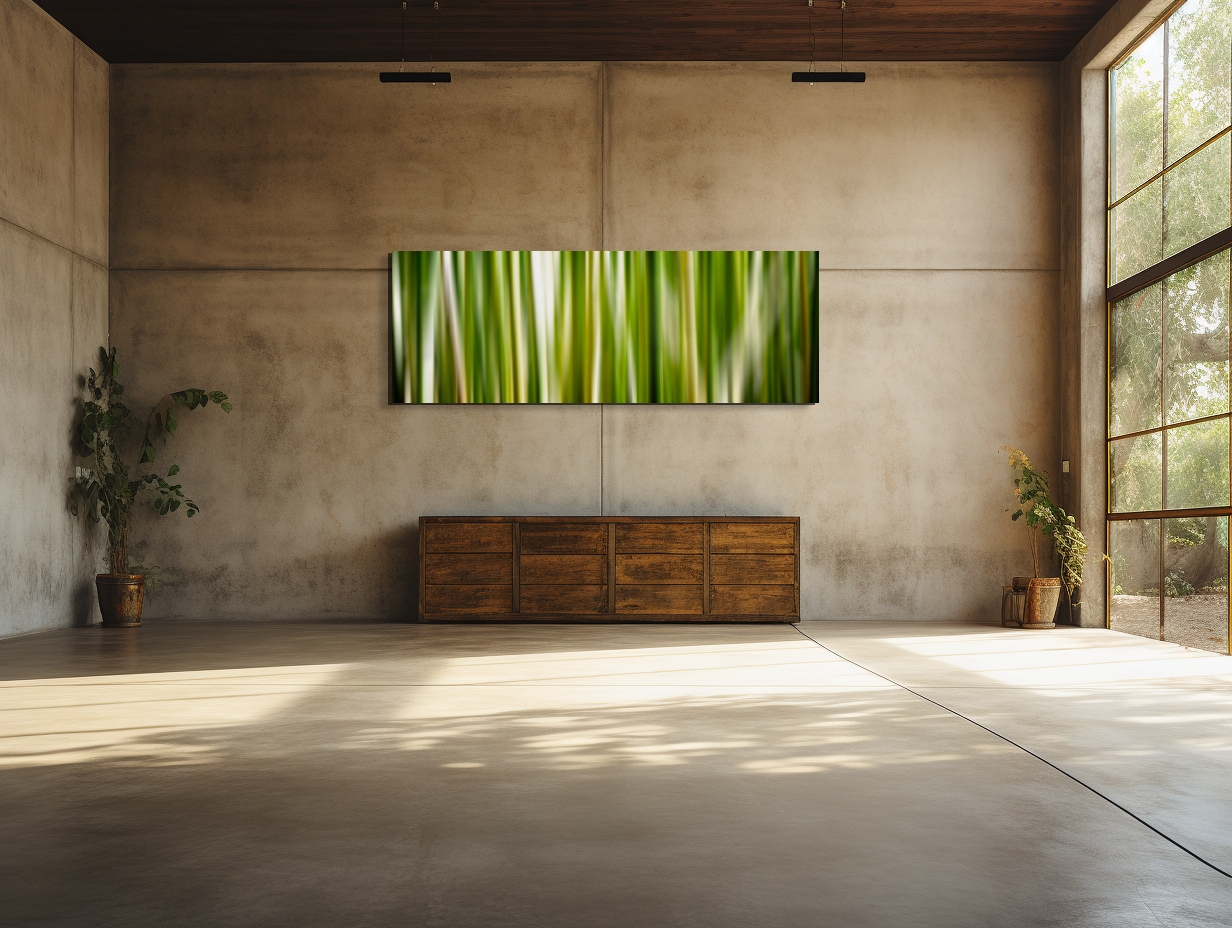 The artwork is an abstract piece characterized by vertical streaks of various green shades, interspersed with white and yellowish lines. The lines possess a blurred effect, creating a sense of motion and a dynamic interplay between light and dark areas. The use of these soft gradients and streaks provides a flowing and organic aesthetic, evoking a sense of natural growth or movement through foliage.