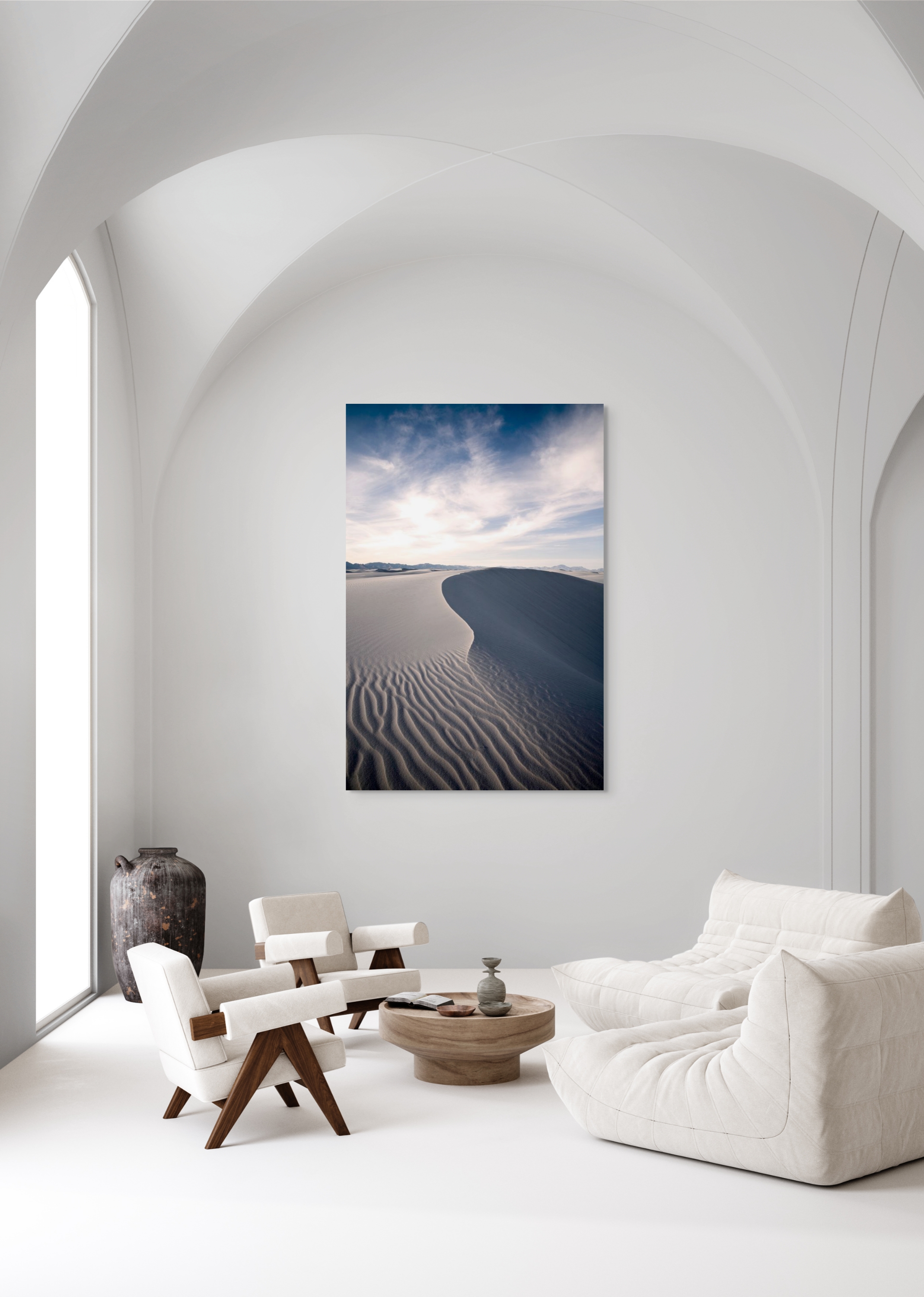 The artwork is a photograph capturing a serene desert landscape. The focus is on a large, undulating sand dune under a vast, open sky. The sand dune displays intricate patterns of wind-swept ridges and textures that lead the eye into the distance. The lighting enhances the depth and contrasts of the sand, giving a sense of both the smooth and rugged surfaces of the dune. The sky above is partly cloudy, with soft, wispy clouds stretching across, adding to the tranquility of the scene. The overall composition exudes a calming, almost ethereal atmosphere, highlighting the raw beauty and simplicity of the natural desert environment.