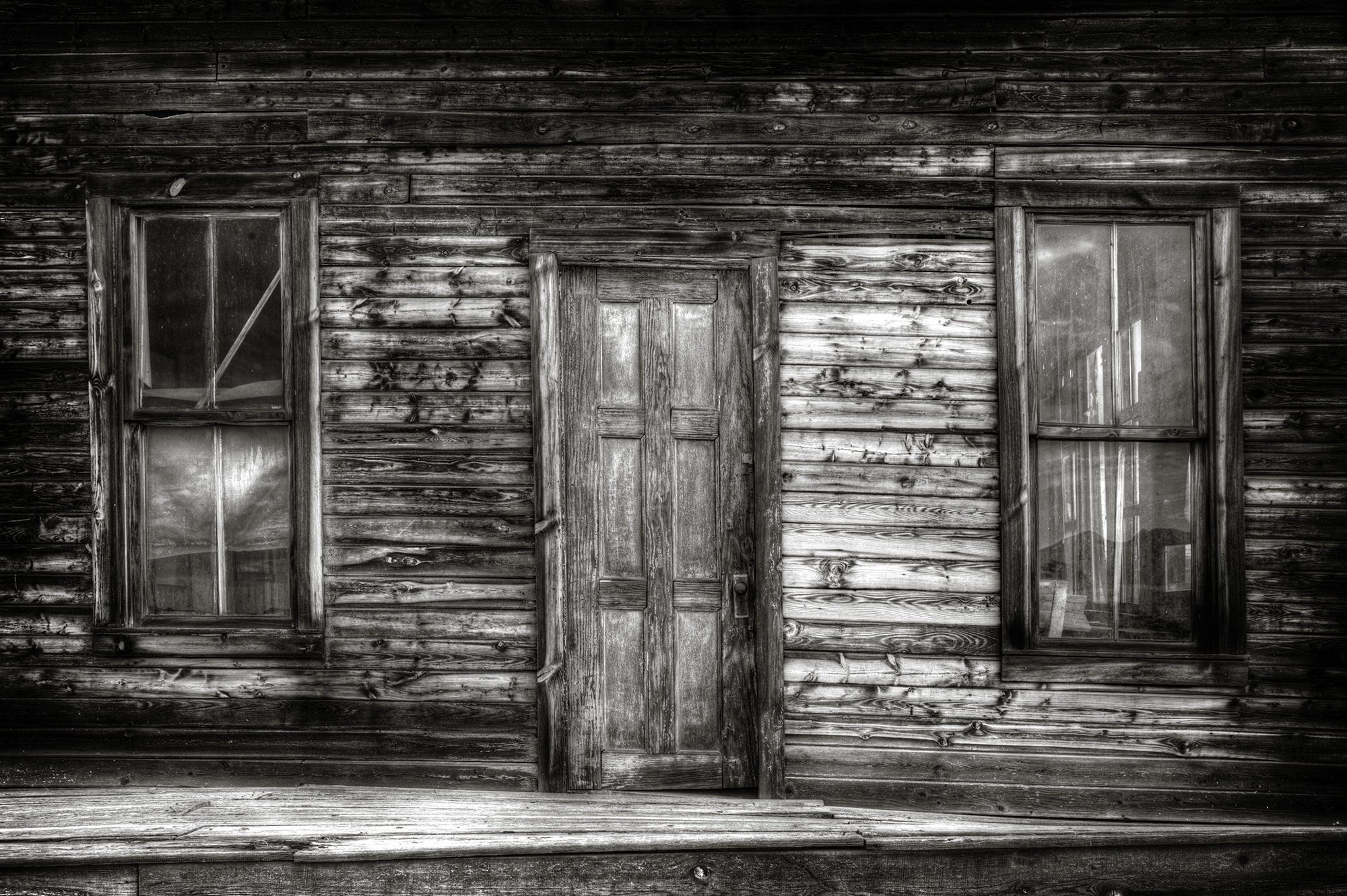 This artwork is a black-and-white photograph depicting the exterior of an old wooden building. The image centers on a weathered doorway situated between two tall, narrow windows. The wooden planks of the structure have a textured, aged appearance, creating a sense of history and abandonment. The composition of the photograph highlights the intricate details of the wood grain and the patterns formed by the weathering of the materials. The overall mood conveyed is one of rustic simplicity and timeless wear.