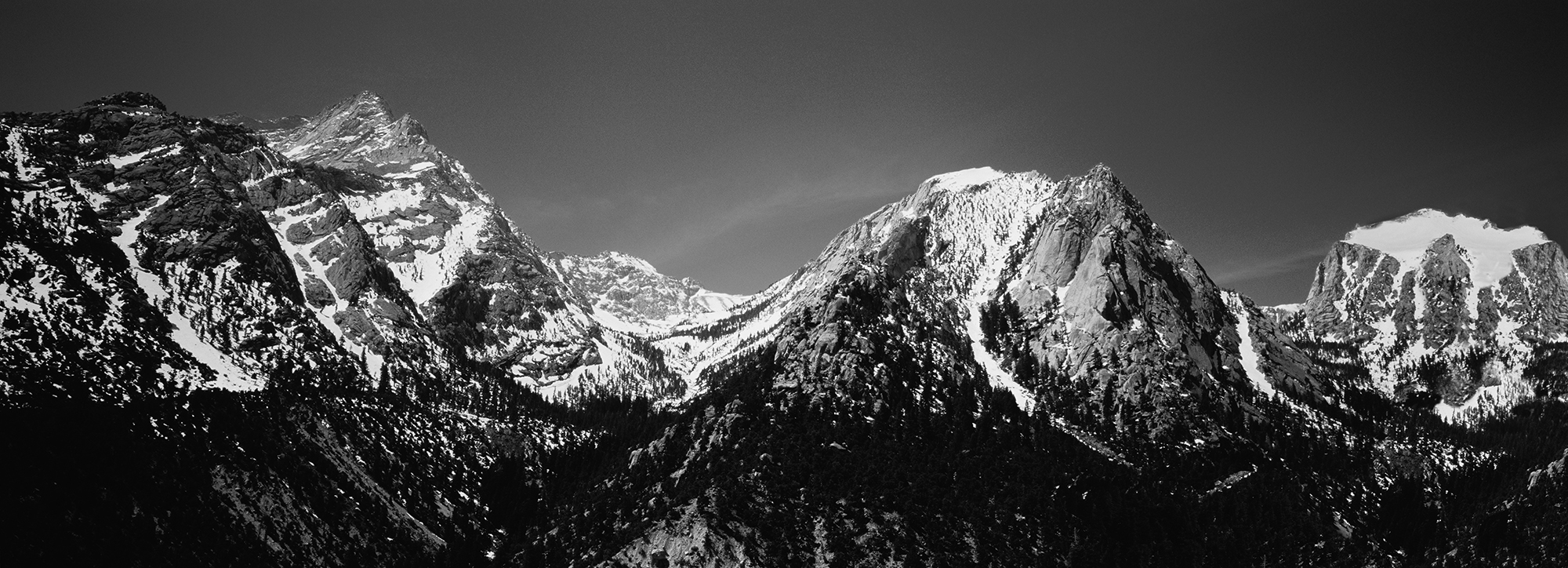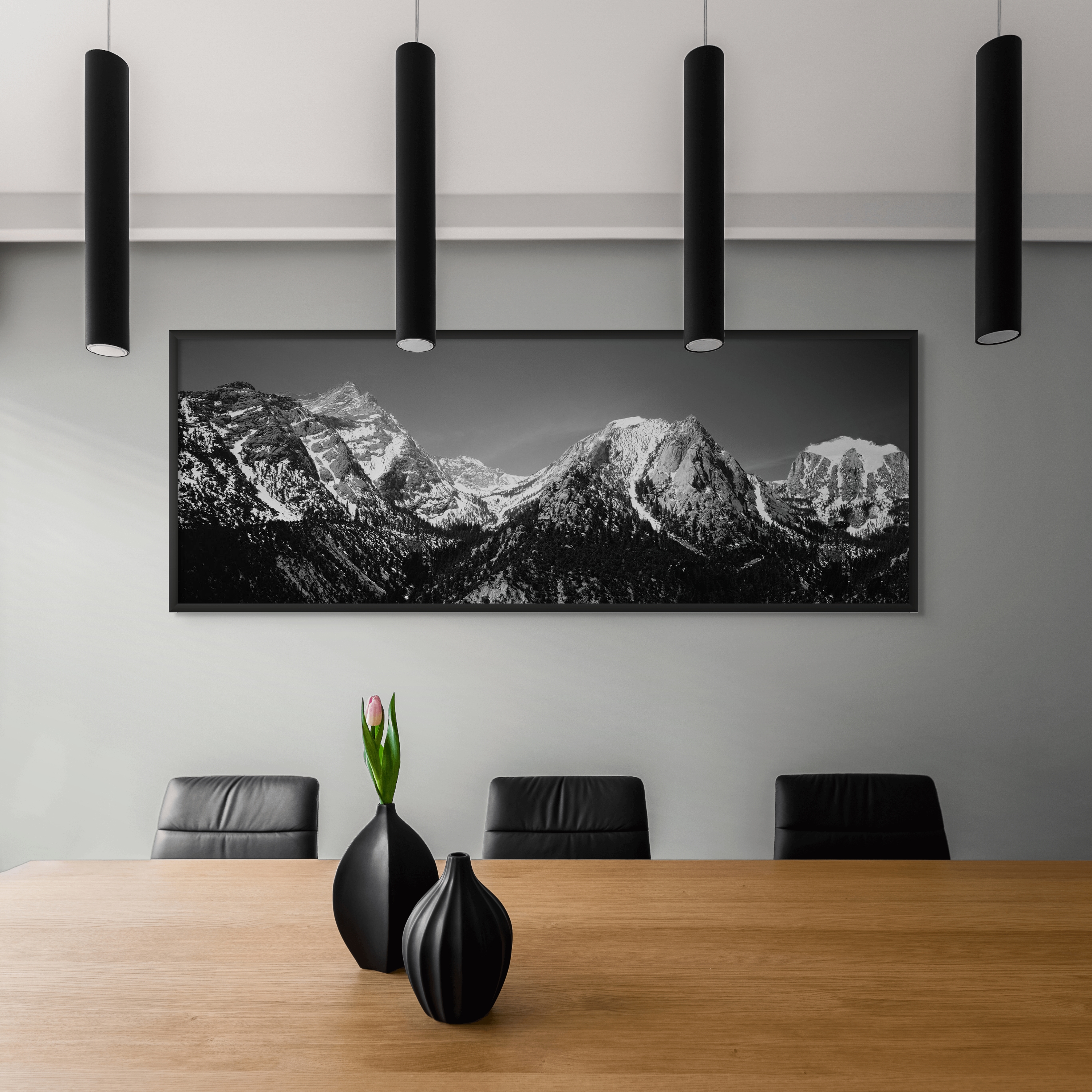 This artwork is a black and white photograph that showcases a stunning mountain range. The mountains are covered in snow, emphasizing their rugged textures and majestic peaks. The composition captures the grandeur and scale of the mountains, with interplay between the shadows and light adding depth and contrast. The sky is clear, contributing to the stark and dramatic mood of the scene. The absence of color allows the viewer to focus on the intricate details and natural beauty of the mountainous landscape.
