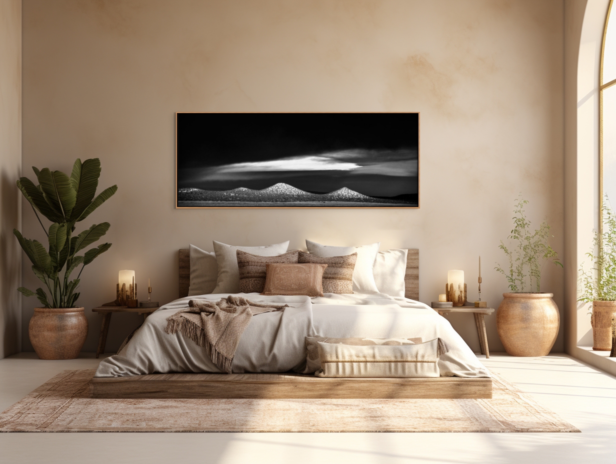 This artwork is a black and white photograph depicting a serene and expansive landscape. The central focus is on a series of rounded hills with varying textures and shades, creating a distinct sense of depth. Above the hills, an elongated, wispy cloud stretches horizontally across the sky, adding an ethereal quality to the scene. The sky itself is a stark, dark contrast to the lighter tones of the land and cloud, enhancing the overall dramatic effect of the composition. The use of monochrome emphasizes the textures and contours of the natural elements, evoking a timeless and contemplative atmosphere.