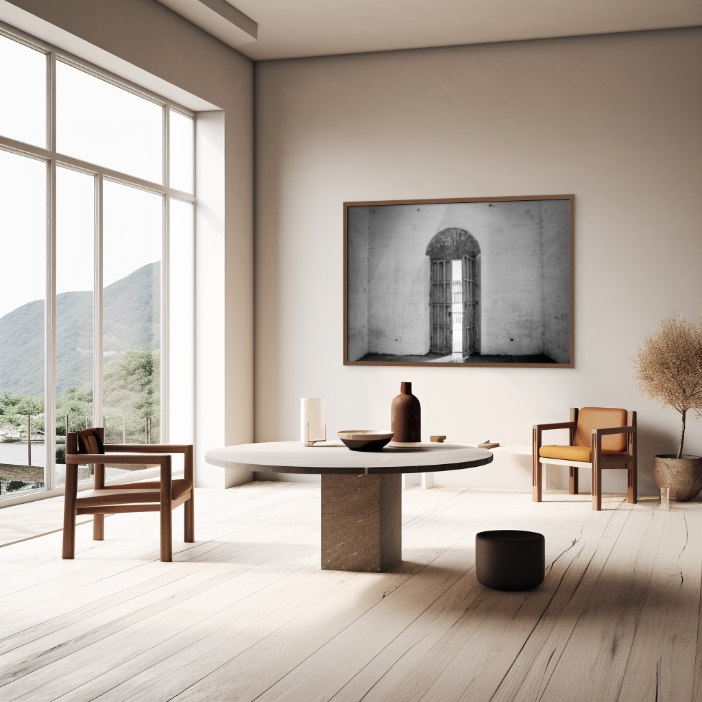 The artwork is a black-and-white photograph featuring an old, partially open, wooden double door set within a rustic arched doorway. The door leads to an outdoor space, with light streaming in and casting shadows on the floor inside the room. The surfaces of the door and walls are weathered, showing signs of age and texture, contributing to a sense of history and abandonment. The overall mood is one of quiet introspection and timelessness, enhanced by the monochromatic color scheme.