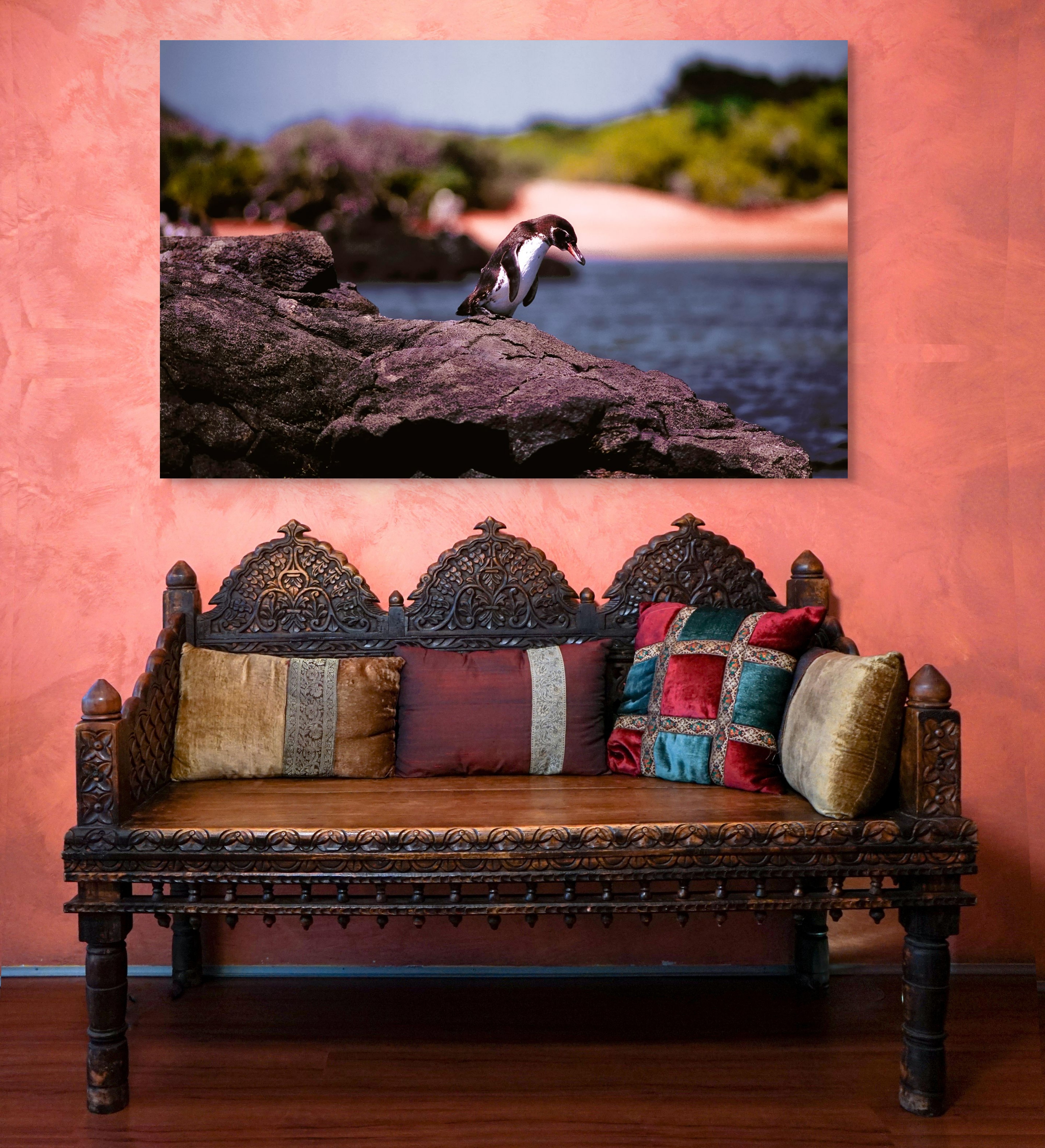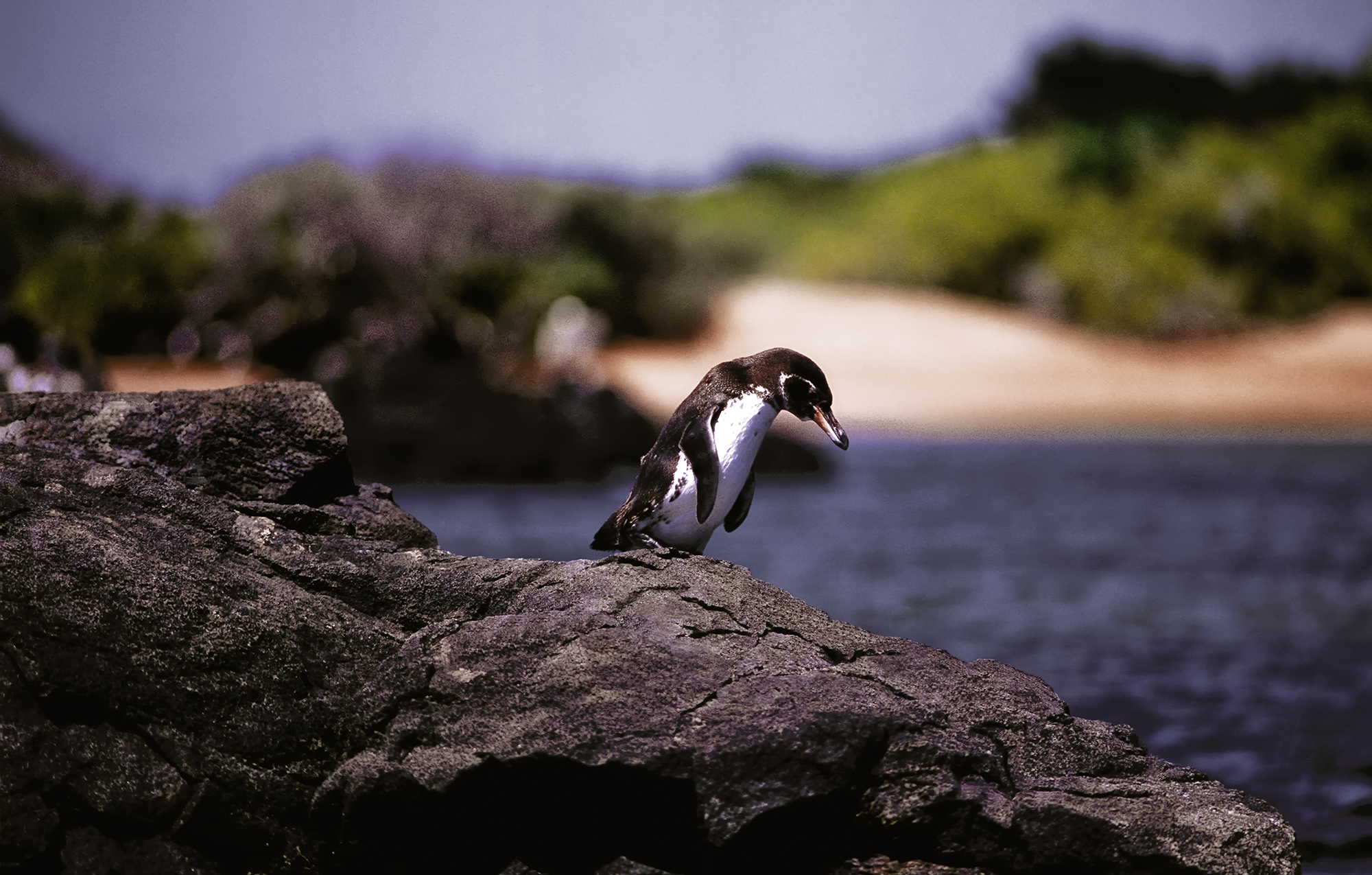 This photograph captures a scene with a penguin poised on a rocky surface. The penguin is positioned on the edge of the rock, appearing to be mid-step or about to jump into the water below. The background is softly focused, featuring natural elements such as blurred vegetation and a body of water, which contrasts with the sharp detail of the penguin and the rocks in the foreground. The image conveys a sense of momentary action and natural beauty.