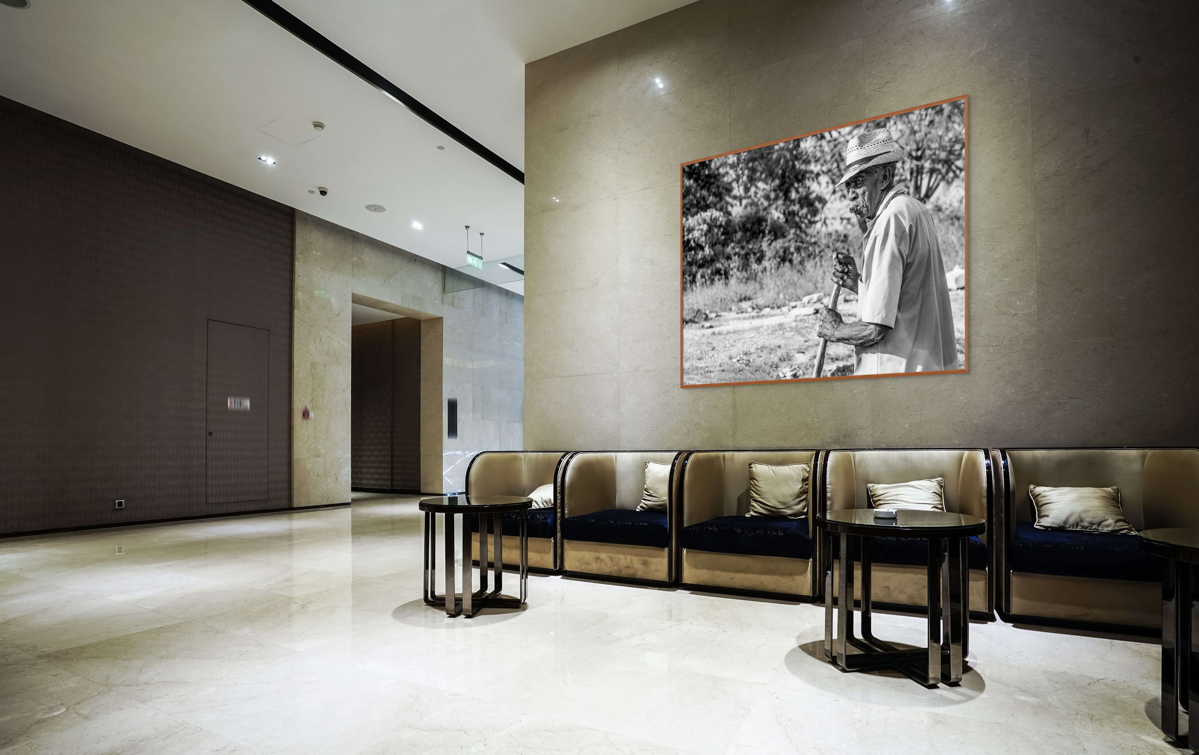 This artwork is a black and white photograph portraying an elderly man wearing a shirt and a straw hat. The man is captured in a natural outdoor setting, holding a walking stick in both hands. His face is expressive, showing lines of age and experience. The image exudes a sense of resilience and the passage of time, emphasizing the texture and detail of his skin and clothing. The background, though blurred, helps to maintain the focus on the man, highlighting his presence as the central subject of the photograph.