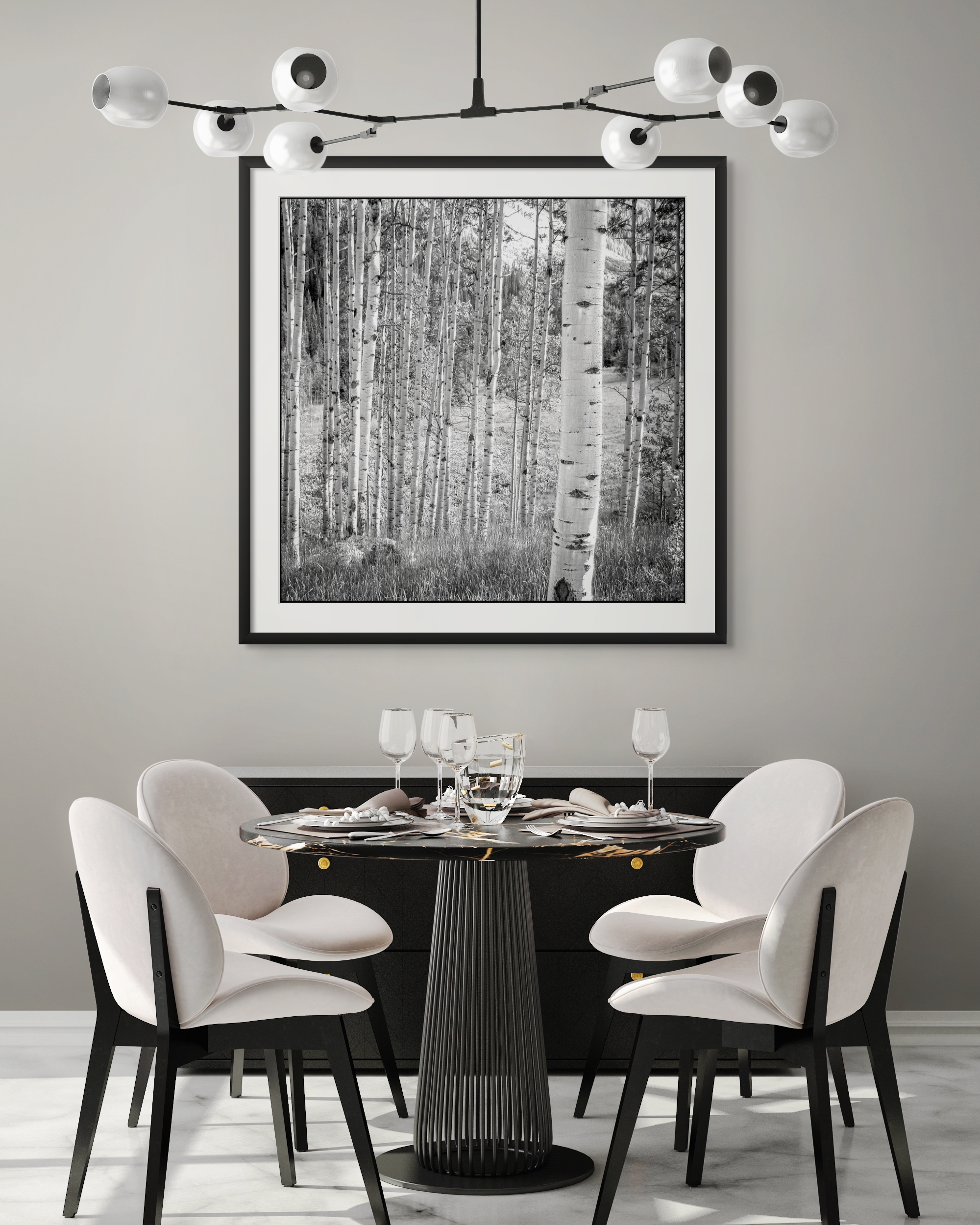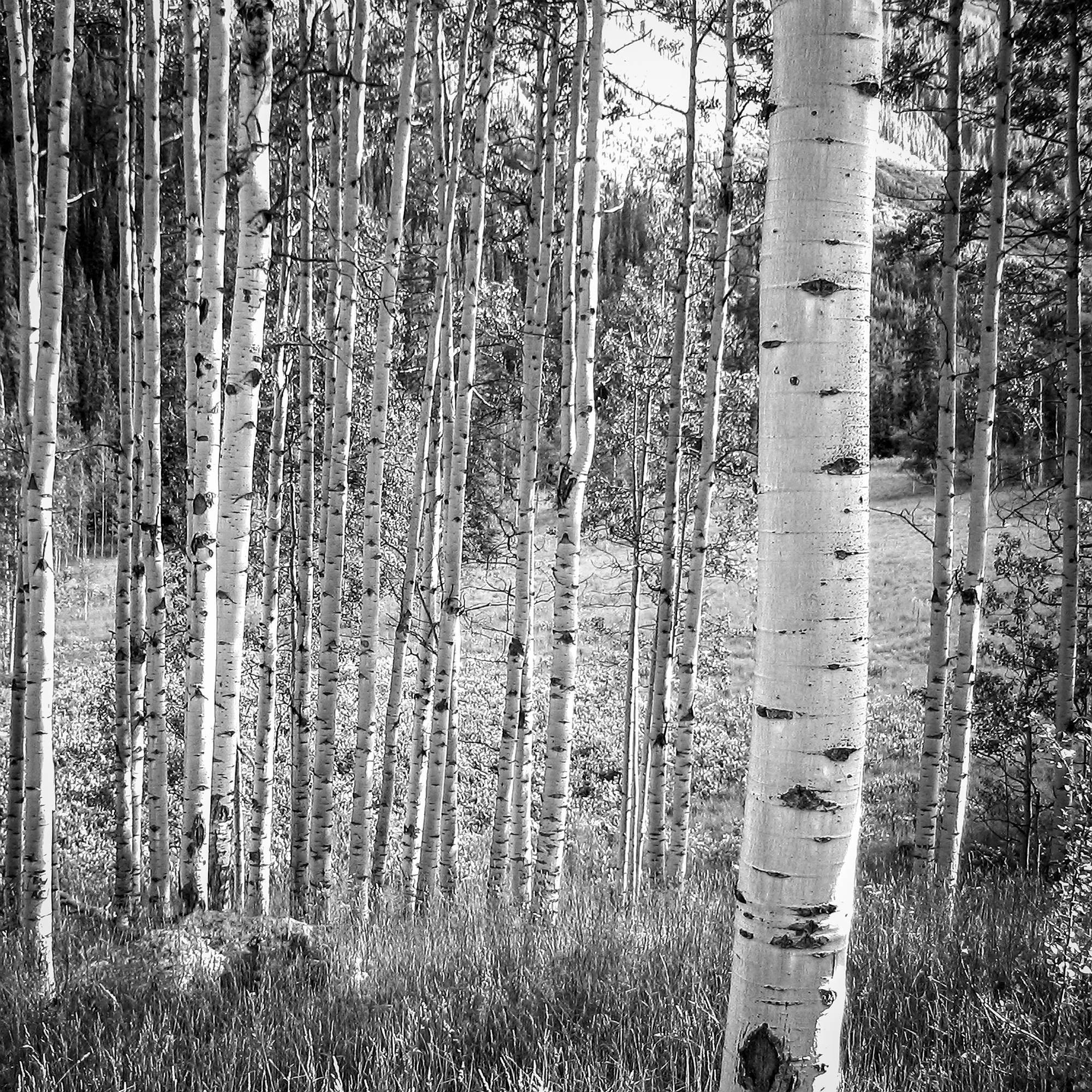 This artwork is a black-and-white photograph capturing a serene forest of tall, slender aspen trees. The trees extend vertically, their smooth bark contrast with the light filtering through the branches. The composition emphasizes the repetitive pattern of the tree trunks, creating a rhythmic and soothing visual effect. The long grass at the base of the trees adds a natural texture to the scene. The lack of color emphasizes the lines and shapes, highlighting the tranquility and simplicity of the natural environment.