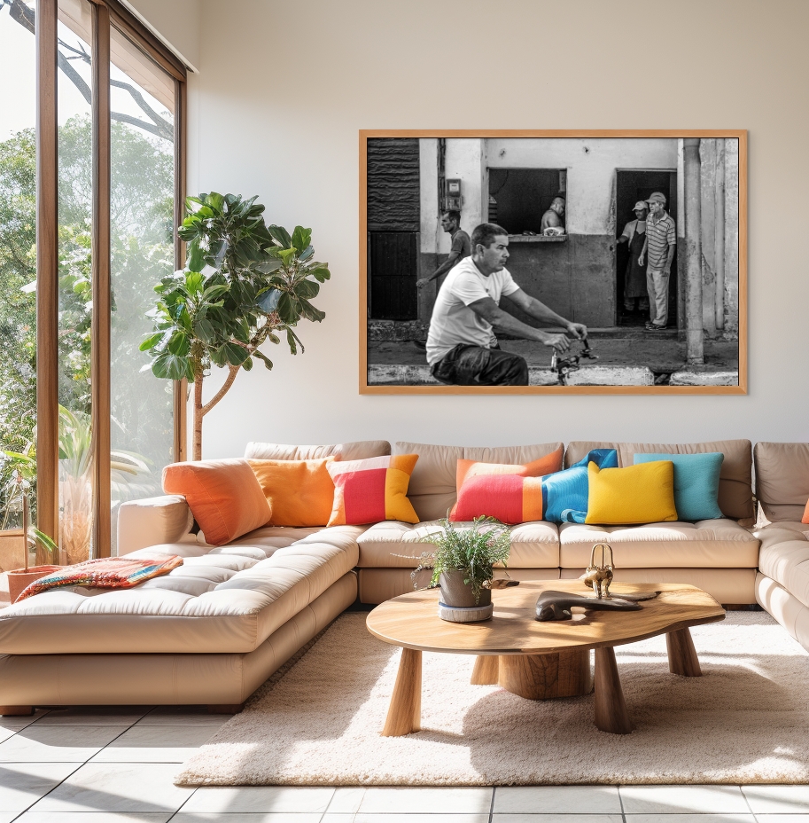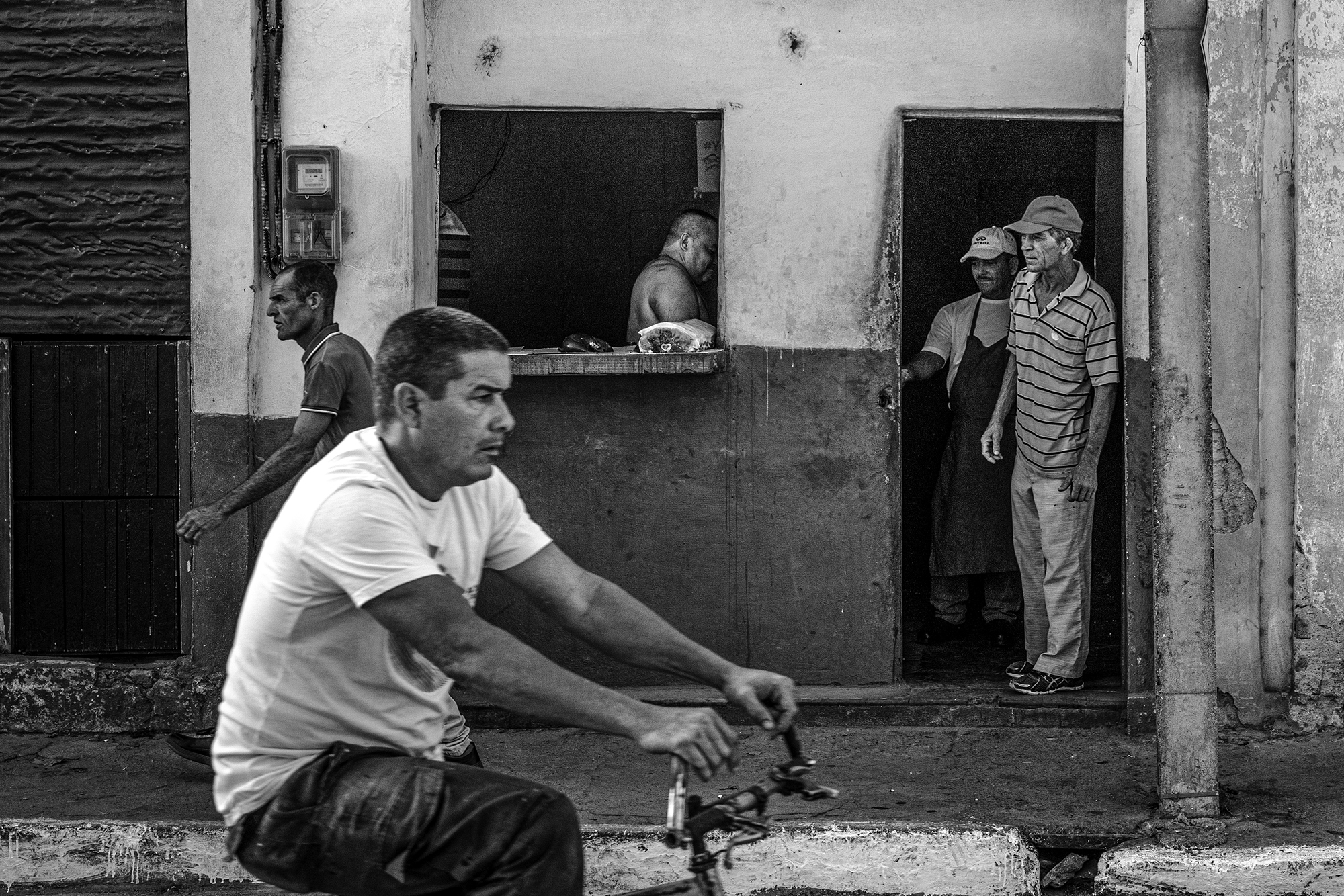 The artwork captures a black and white street scene featuring everyday life. In the foreground, a man on a bicycle rides past, his expression focused and intent. To his left, another man walks, seemingly in his own world. The background shows a simple building with an open window and an open door. At the window, a shirtless man is engaged in some activity, possibly related to work, while inside the doorway stand two men, one in a striped shirt and cap, the other wearing an apron and cap. The texture of the walls and the concrete street add to the scene's gritty, candid atmosphere, creating a vivid snapshot of routine urban life.